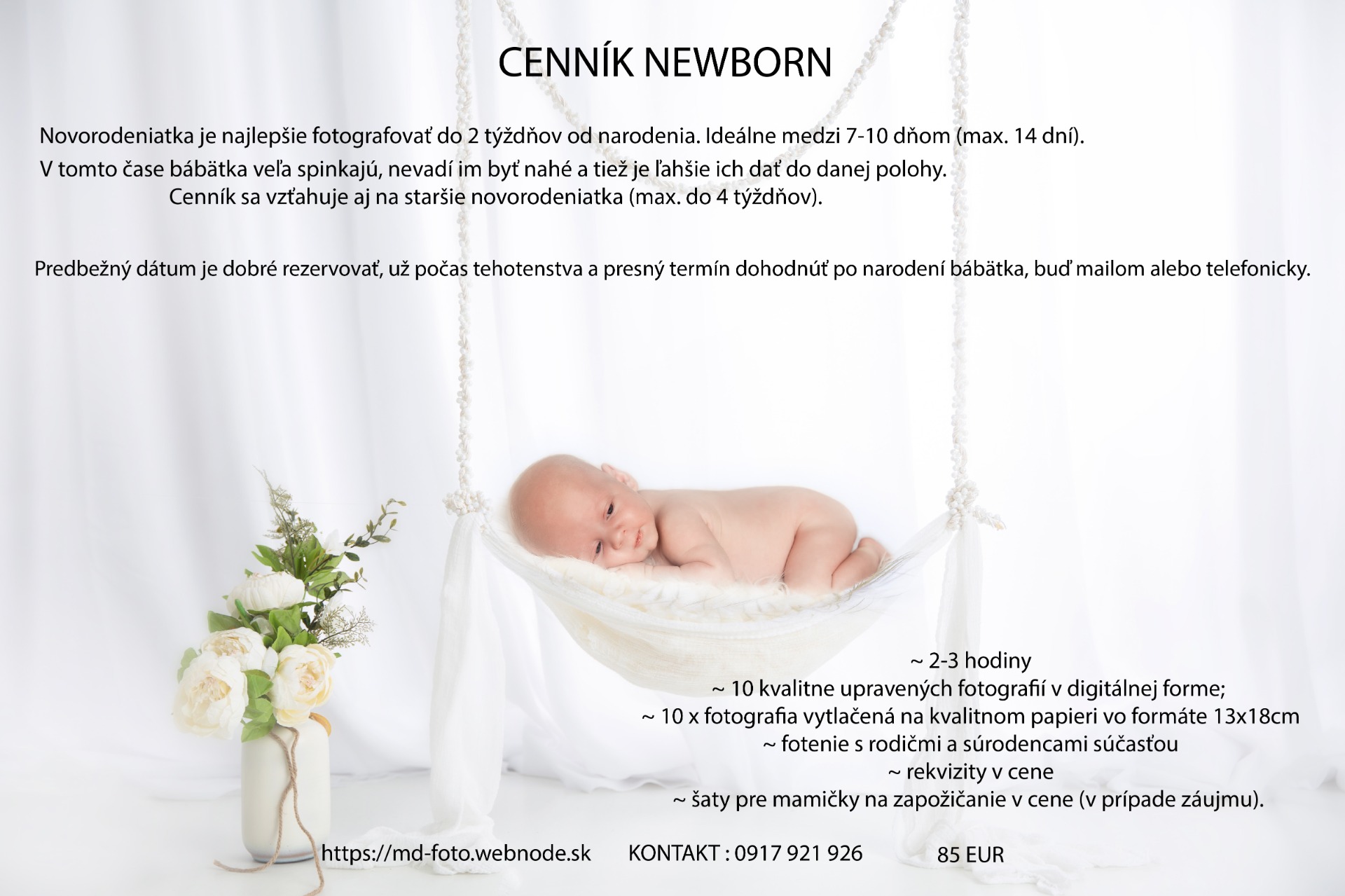 Novorodeniatka je najlepšie fotografovať do 2 týždňov od narodenia. Ideálne medzi 7-10 dňom (max. 14 dní). V tomto čase bábätka veľa spinkajú, nevadí im byť nahé a tiež je ľahšie ich dať do danej polohy. Cenník sa vzťahuje aj na staršie novorodeniatka (max. do 4 týždňov).